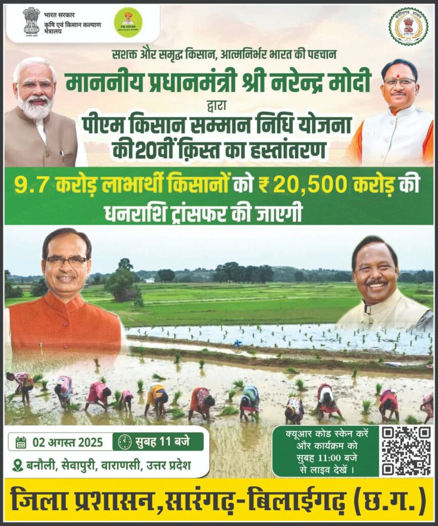 रायपुर/सारंगढ़-बिलाईगढ़, 02 अगस्त 2025 — किसानों की खुशहाली के लिए आज का दिन ऐतिहासिक है। प्रधानमंत्री किसान सम्मान निधि योजना की 20वीं किस्त के तहत देशभर के 9.7 करोड़ किसानों को 20,500 करोड़ रुपये की राशि अंतरित की जा रही है। यह राशि प्रधानमंत्री नरेंद्र मोदी द्वारा आज सुबह 11:00 बजे बनौली, सेवापुरी, वाराणसी (उत्तर प्रदेश) से वर्चुअल कार्यक्रम के माध्यम से हस्तांतरित की गई।