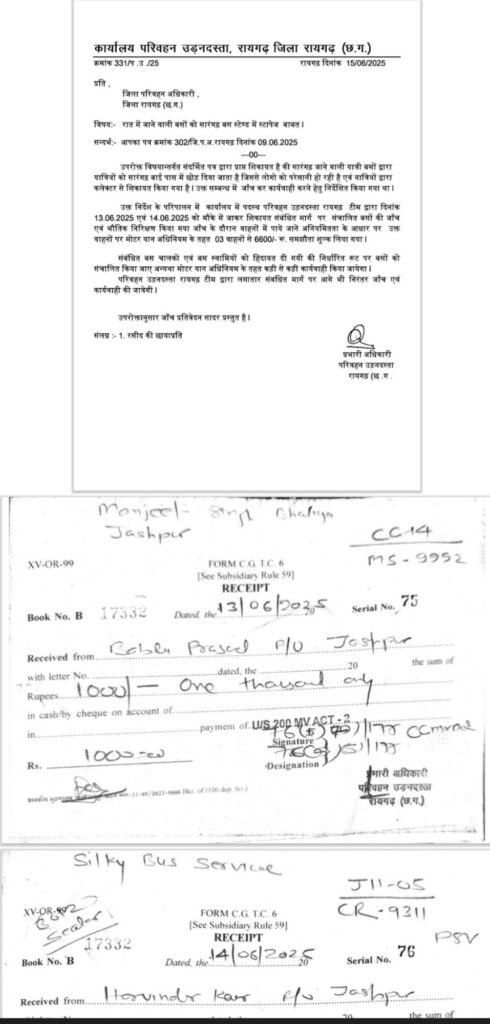 आरटीओ उड़नदस्ता रायगढ़ ने की राधेकृष्ण, सिल्की और सनी रात्रि बस पर कार्रवाई