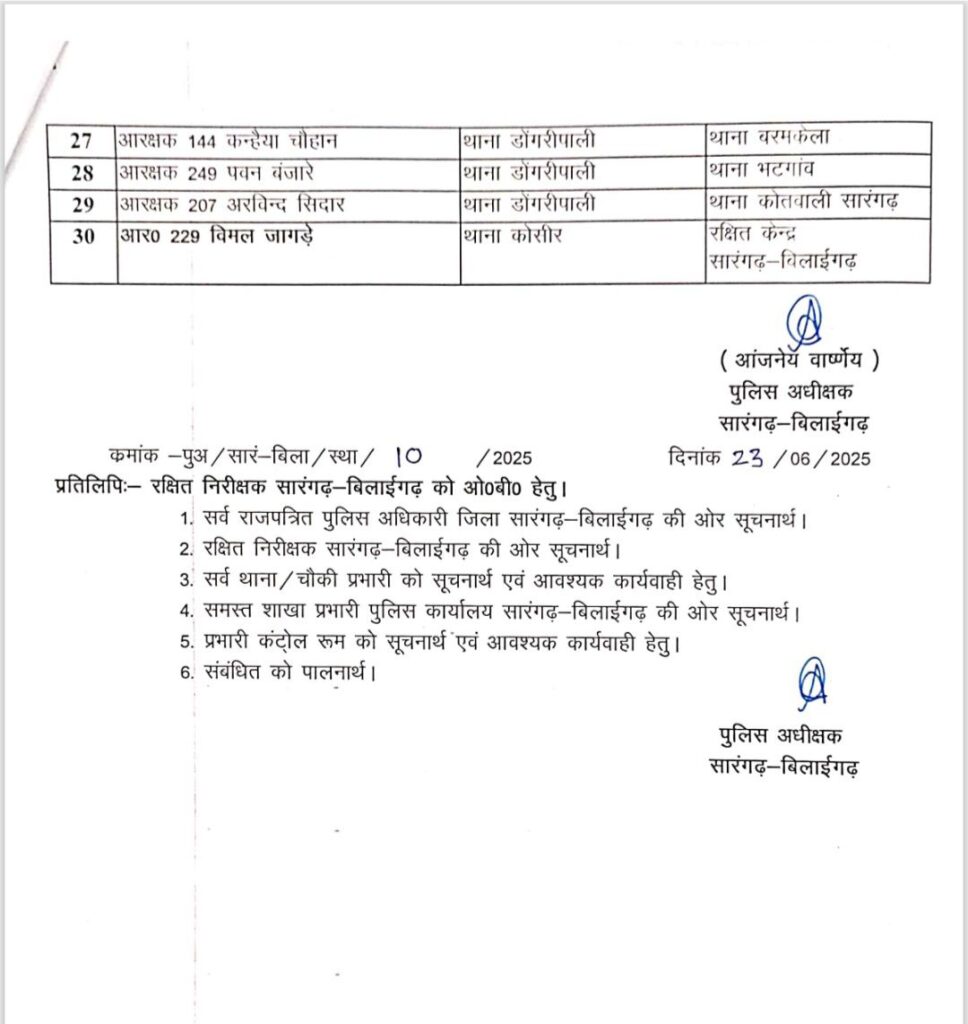 ब्रेकिंग न्यूज़: सारंगढ़-बिलाईगढ़ पुलिस विभाग में बड़ा फेरबदल, 30 अधिकारियों-कर्मचारियों का तबादला