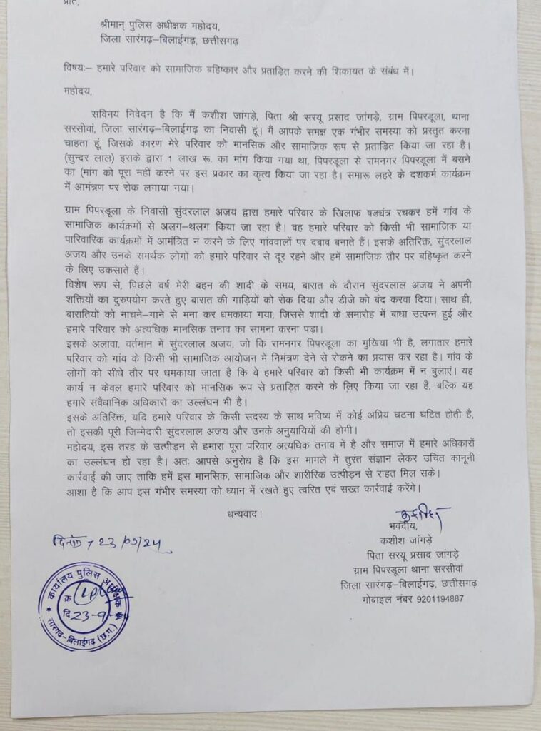 सारंगढ़-बिलाईगढ़: ग्राम पिपरडूला निवासी कशीश जांगड़े ने थाना सरसीवां और पुलिस अधीक्षक कार्यालय में अपने परिवार के खिलाफ हो रहे सामाजिक बहिष्कार और प्रताड़ना के मामले में शिकायत दर्ज कराई है। शिकायत के अनुसार, गांव के निवासी सुंदरलाल अजय द्वारा उनके परिवार को सामाजिक और मानसिक रूप से प्रताड़ित किया जा रहा है।सुंदरलाल द्वारा ₹100000 का मांग किया गया था , पिपरडूला से रामनगर पिपरडूला में बसने का व मांग पूरा नहीं करने पर इस प्रकार का कृत्य करवाया जा रहा है। हाल ही में समारू लहरे के देहांत कार्यक्रम में आमंत्रण पर रोक लगाया