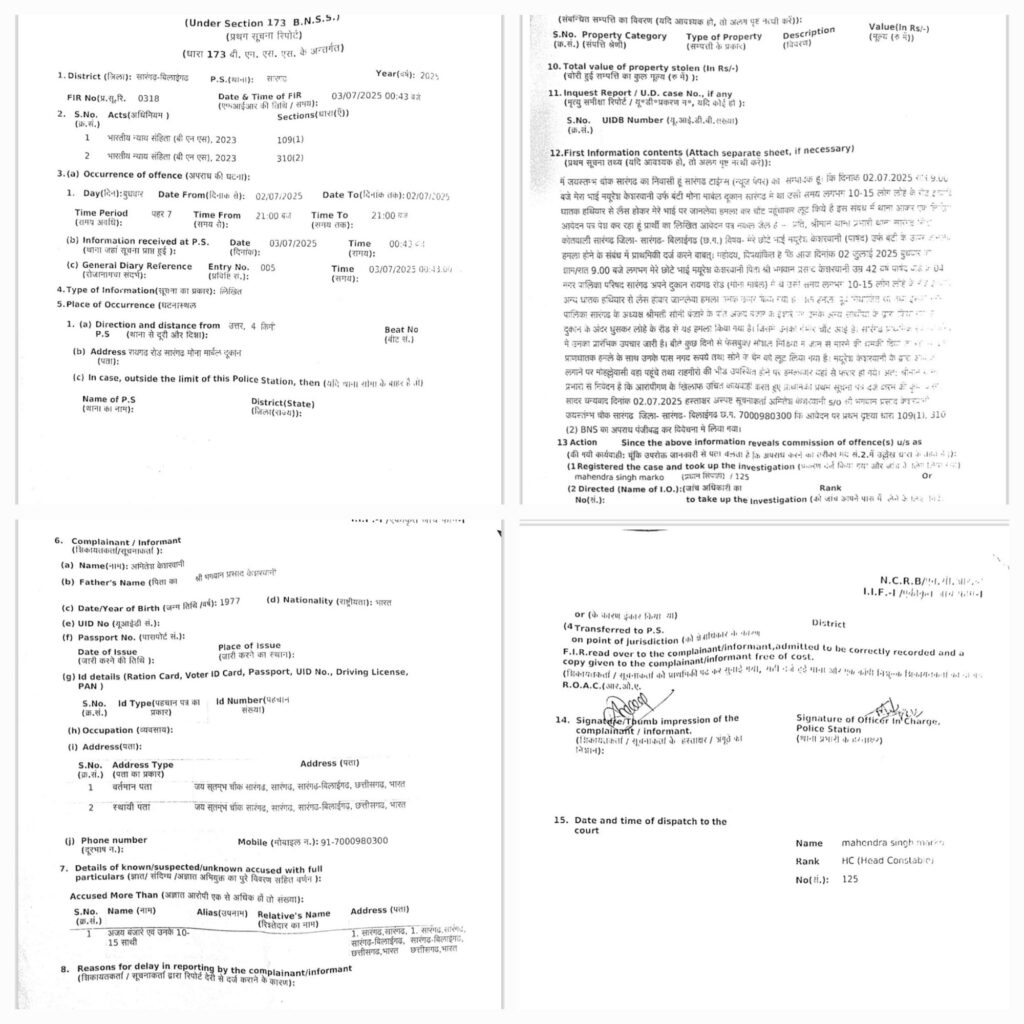 सारंगढ़ में असामाजिक तत्वो का तांड़व आज देरशाम को देखने को मिला जब नगर पालिका सारंगढ़ के पार्षद तथा भाजपा नेता मयूरेश केशरवानी पर 15 से अधिक लोगो ने लोहे के राड़ और अन्य घातक हथियार से ताबड़तोड़ हमला कर दिया। हमले मे बुरी तरह से घायल मयूरेश को तुरंत ही शासकीय हस्पताल ले जाया गया जहा पर उनकी हालत अभी खतरे से बाहर है। लेकिन सर, पीठ, कमर आदि में गहरी चोट आई है। हमला नगर पालिका अध्यक्ष के पति अजय बंजारे और उनके साथियो ने किया। बताया जा रहा है कि राज्य शासन ने 2 जुलाई को ही नपा अध्यक्ष सोनी बंजारे को पद से बर्खास्त घोषित कर दिया जिसके रोष में उन्होने मयूरेश पर हमला किया। इस हमले की जानकारी मिलते ही भाजपाईयो की भीड़ अस्पताल तथा थाना परिसर में एकत्रित होकर आरोपियो पर त्वरित कार्यवाही की मांग पर अड़े रहे। देररात आरोपी अजय बंजारे और अन्य साथियो के खिलाफ बीएनएस 109(1), 310(2) के तहत अपराध पंजीबद्ध कर लिया है।