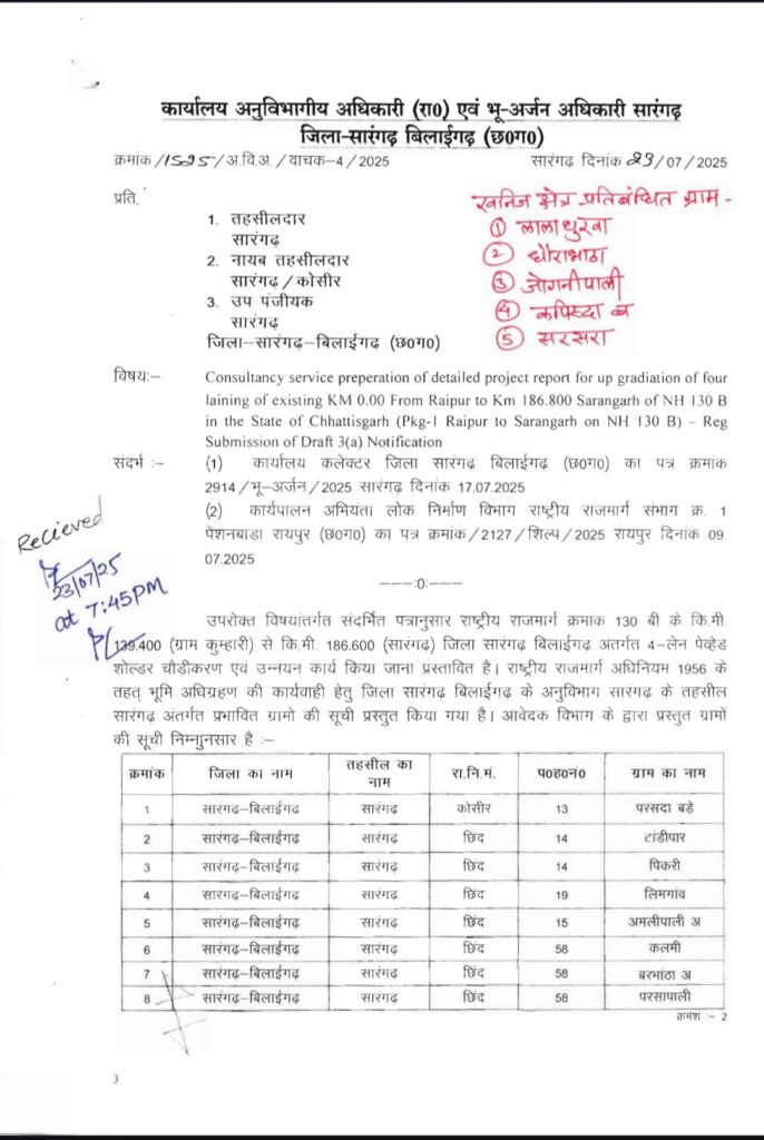 कलेक्टर कार्यालय सारंगढ़-बिलाईगढ़ द्वारा जारी आदेश क्रमांक 2914/भू-अर्जन/2025 दिनांक 17.07.2025 के अनुसार, यह फोरलेन निर्माण कार्य किमी 139.400 (कुहारी) से लेकर किमी 186.600 (सारंगढ़) तक प्रस्तावित है। इसके तहत ज़िले की तहसील सारंगढ़ के अंतर्गत कुल 30 गांवों की भूमि प्रभावित होगी।