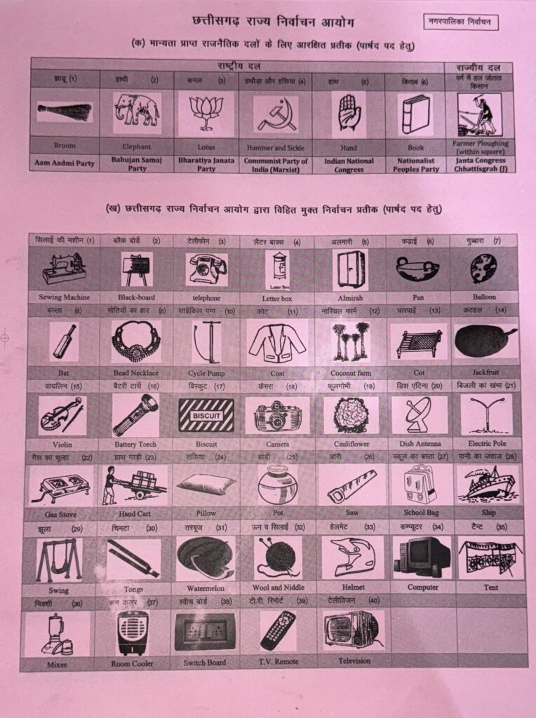 सारंगढ़ बिलाईगढ़, 24 जनवरी 2025/ नगरपालिका आम निर्वाचन 2025 के लिए छत्तीसगढ़ राज्य निर्वाचन आयोग ने राज्य के सभी कलेक्टर को सभी नगरीय निकायों में पार्षद सहित नगरपालिक निगम में महापौर, नगरपालिका और नगर पंचायत में अध्यक्ष पद हेतु नाम निर्देशन पत्र में प्रतीक चिन्ह के उपयोग के लिए पत्र जारी किया है। इसके अनुसार मान्यता प्राप्त राष्ट्रीय, राज्यीय और अमान्यता प्राप्त रजिस्ट्रीकृत राजनैतिक दल के लिए आरक्षित प्रतीक चिन्ह से अलग प्रतीक चिन्ह की सूची जारी किया है।
