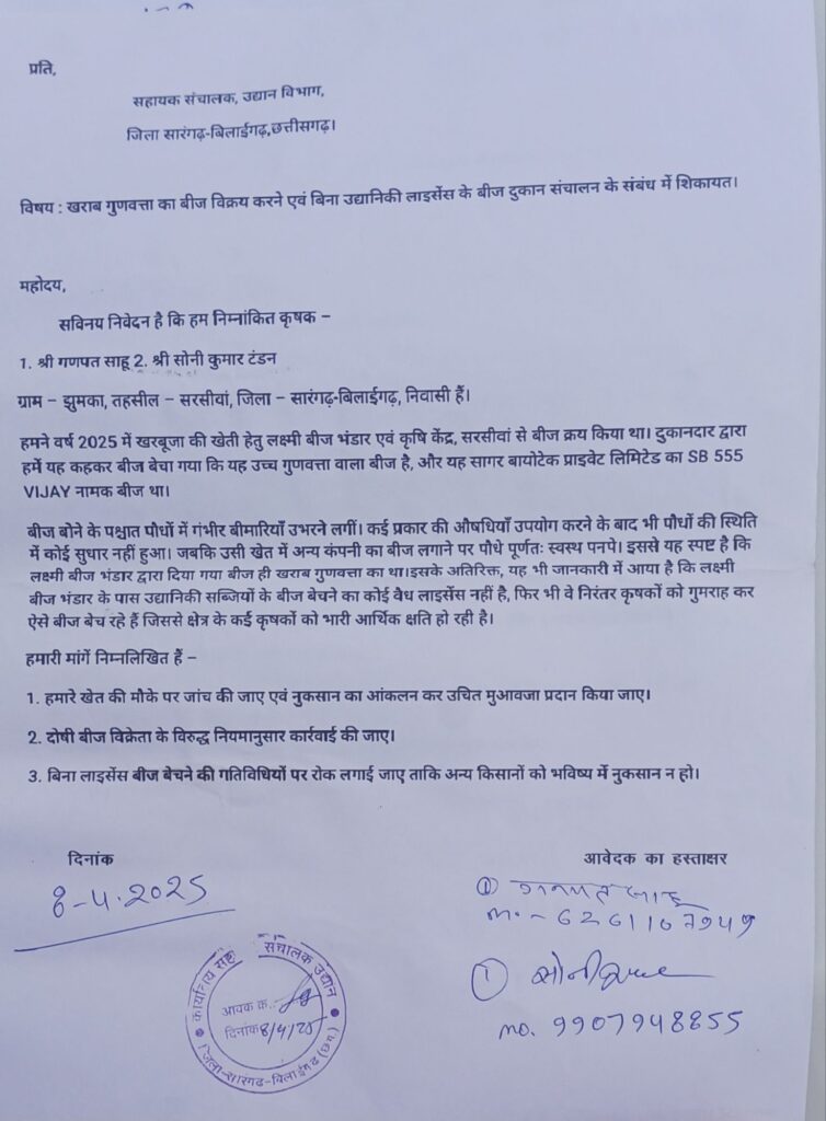 ग्राम झुमका के दो किसानों गणपत साहू और सोनी कुमार टंडन ने लक्ष्मी बीज भंडार एवं कृषि केंद्र, सरसीवा पर खराब गुणवत्ता वाला खरबूजा बीज बेचने का गंभीर आरोप लगाया है। किसानों का कहना है कि दुकानदार ने बीज को “उन्नत गुणवत्ता वाला” और “रोग प्रतिरोधक क्षमता युक्त” बताते हुए उन्हें गुमराह किया। लेकिन बीज बोने के बाद पौधों में गंभीर बीमारियाँ आ गईं, जिससे पूरी फसल नष्ट हो गई।